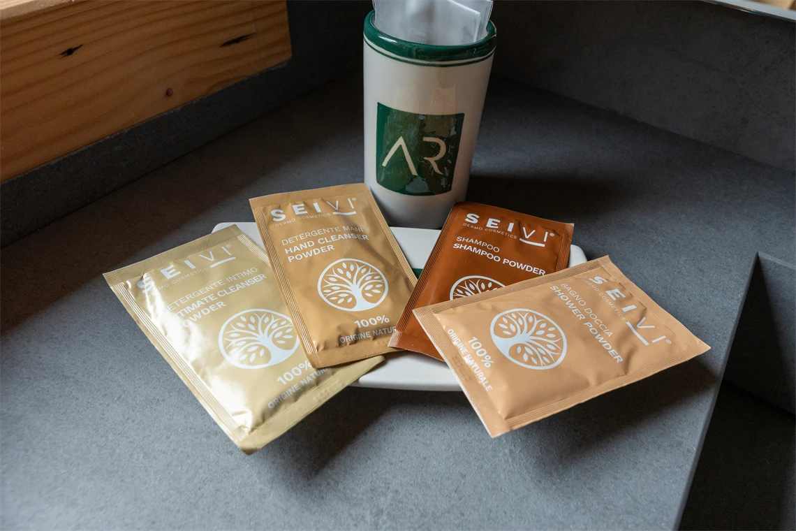 Per il nostro set cortesia e tutti i prodotti dell'area benessere, abbiamo scelto un laboratorio di Urbino che ha realizzato appositamente per noi una linea cosmetica 100% naturale a partire dal packaging plastic-free, fino alla composizione in polvere dei prodotti per il corpo e delle essenze dei diffusori a base di oli essenziali che rilasciano una particolare profumazione derivante dallo scotano, pianta tipica del nostro territorio.