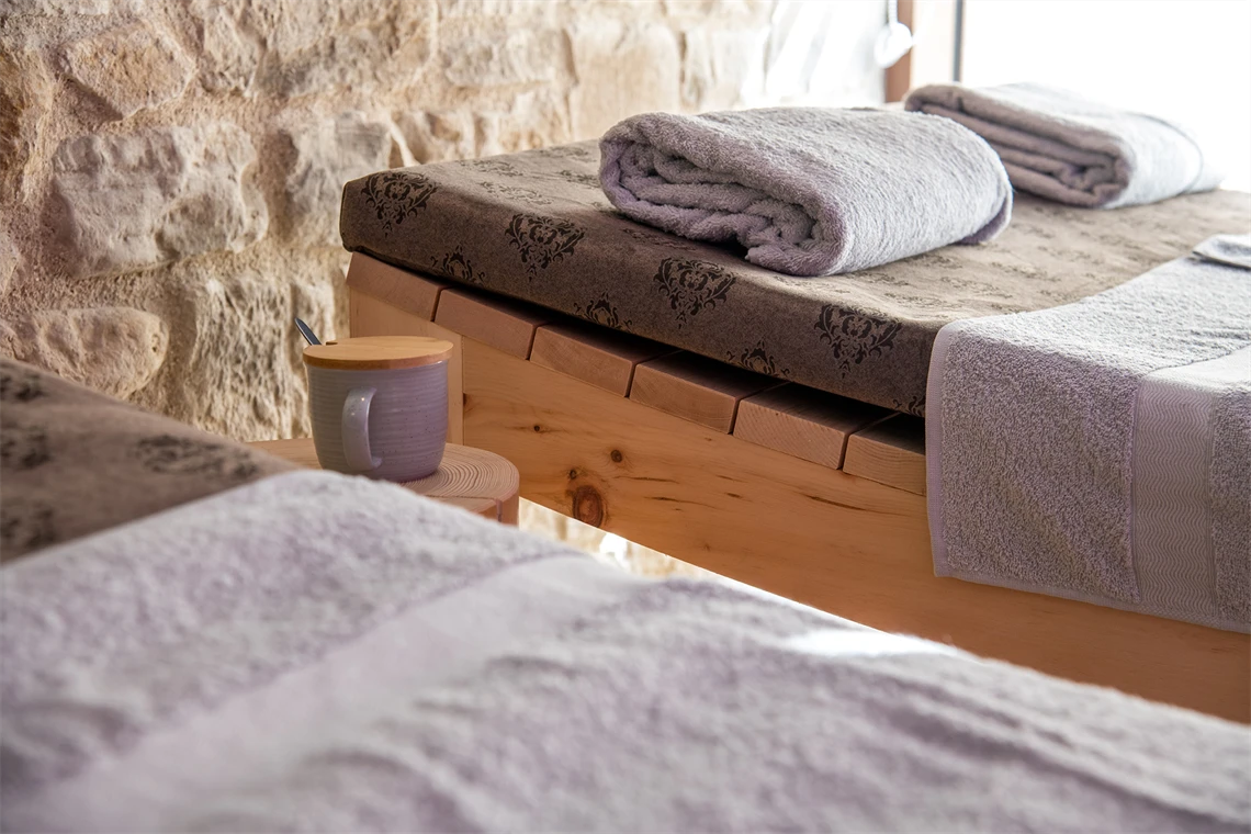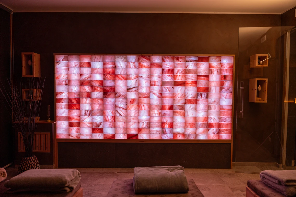 L’area relax di Aura Relais è dominata dalla scenografica parete di sale retroilluminata che combina i benefici dell’Haloterapia (ossia la terapia del sale) con la cromoterapia.