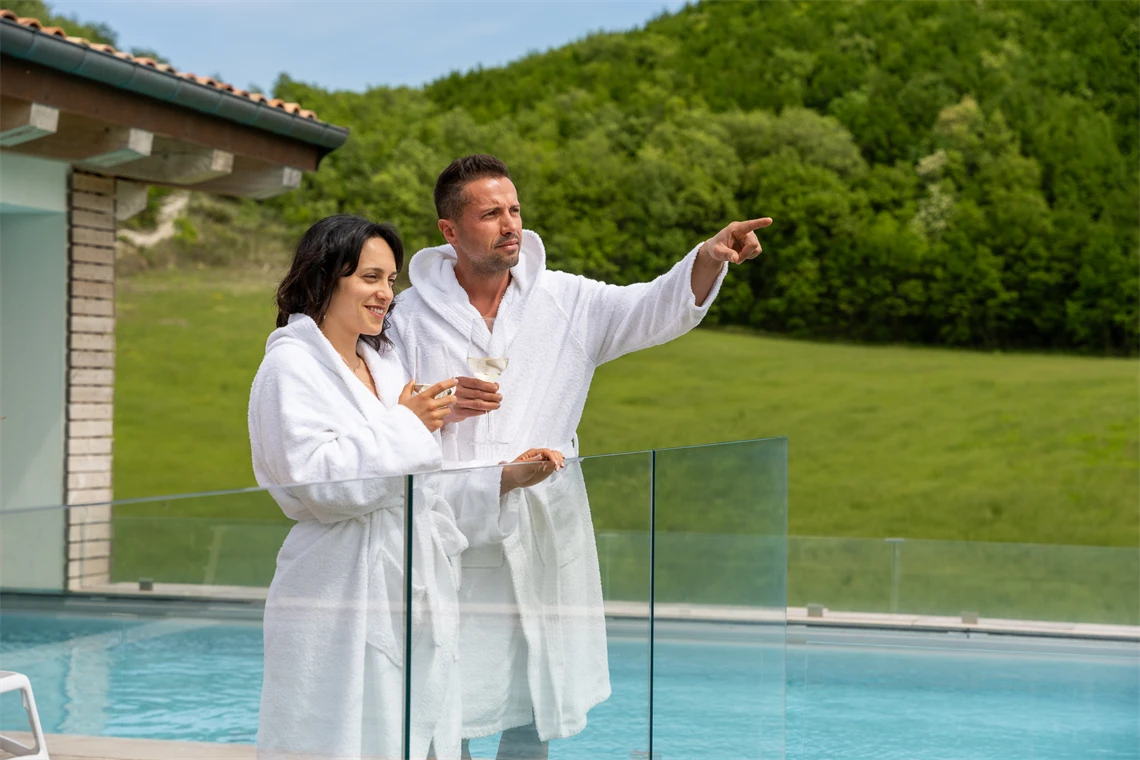 Il bagno in piscina sarà quindi un’esperienza di estremo relax e quiete, con una vista meravigliosa sullo splendido paesaggio che circonda la struttura.